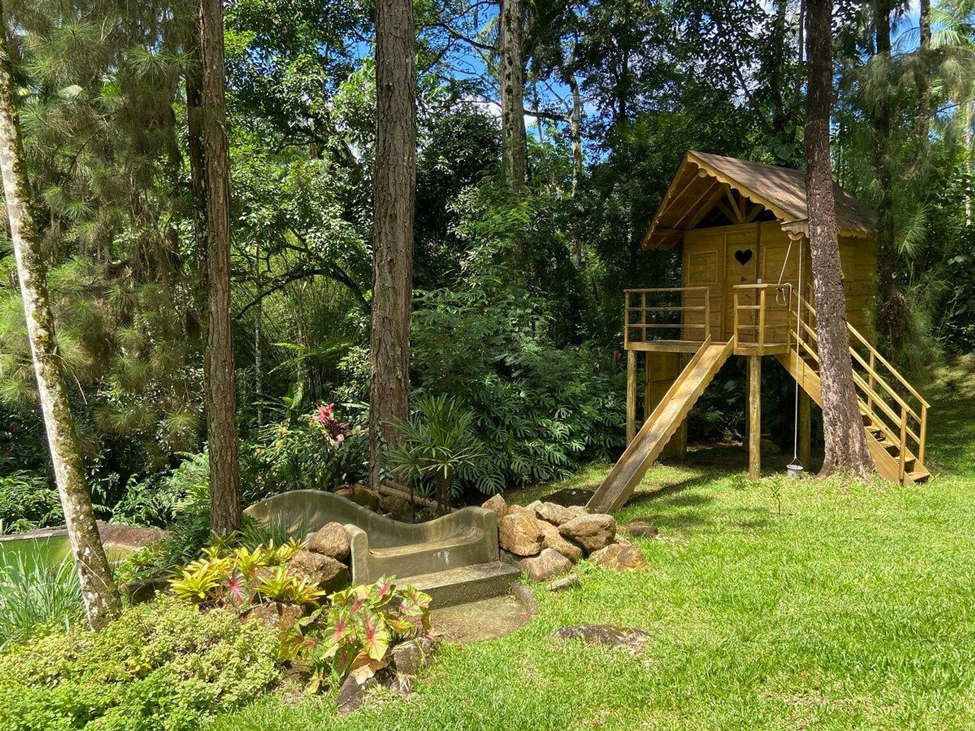 Possui dois riachos que cruzam a propriedade e uma piscina de água natural espetacular com uma área própria para crianças pequenas e um tobogã para todas as idades. Possui todas as amenidades necessárias para curtir momentos incríveis com sua família (crianças a partir de 6 anos pagam) e amigos, área social aberta e integrada com lareira, smart tv de 55 polegadas, internet de fibra ótica, varanda espaçosa, para relaxar ao fim da tarde ao som das águas, quartos confortáveis, suíte master ampla com closet e banheiro grande com banheira hidromassagem para duas pessoas, banheiros com chuveiros à gás, cozinha completa com máquina de lavar louça, microondas, fogão, geladeira, cafeteira e muito mais. Possui também anexo com área de churrasqueira e deck com lounge.