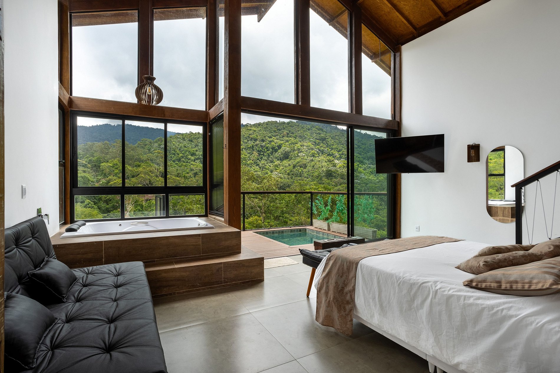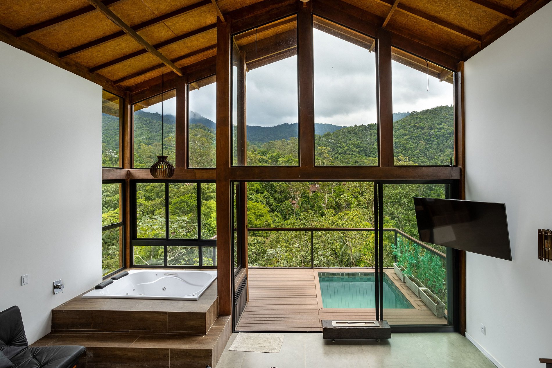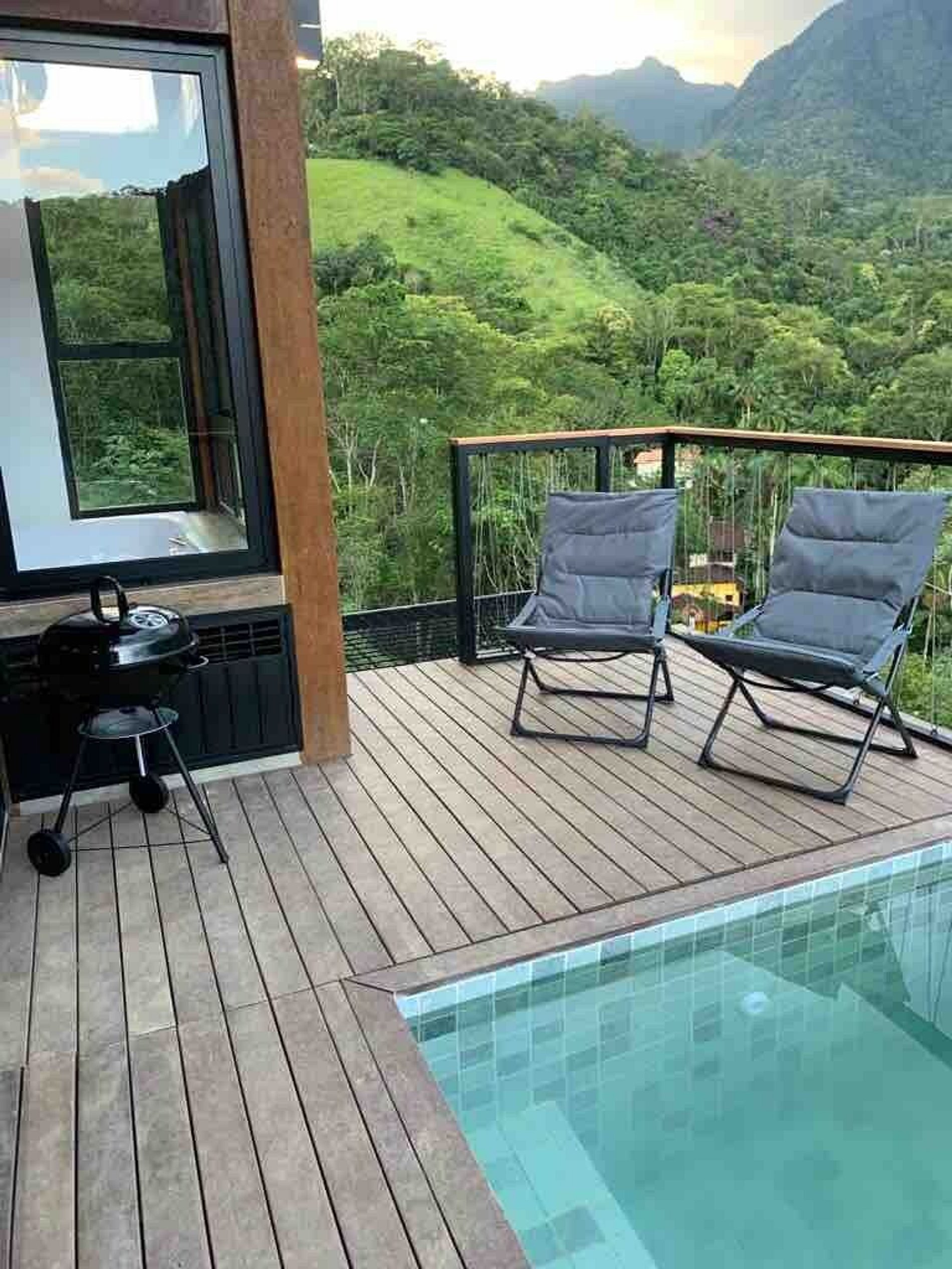 O chalé possui 45 m2 internos e mais 15 mts2 de deck, com piscina, possui um conceito aberto com área interna abrindo para o deck com painéis de vidro que trazem a serra da Índia para dentro do espaço, foi projetado para proporcionar uma experiência única e inesquecível. Possui todas as amenidades necessárias para tornar o espaço aconchegante e relaxante, possui lareira ecológica, cama queen e smart TV 55”, com streaming disponível, internet de fibra ótica, banheiro com chuveiro à gás, secador e toalhas, banheira hidromassagem para dois, cozinha completa, com mesa, cooktop, micro-ondas, geladeira, cafeteira, sanduicheira, aparelho de fondue e demais utensílios. Possui berço disponível (caso solicitado e conforme disponibilidade). Deck externo, com piscina privativa, churrasqueira e uma vista de tirar o fôlego!