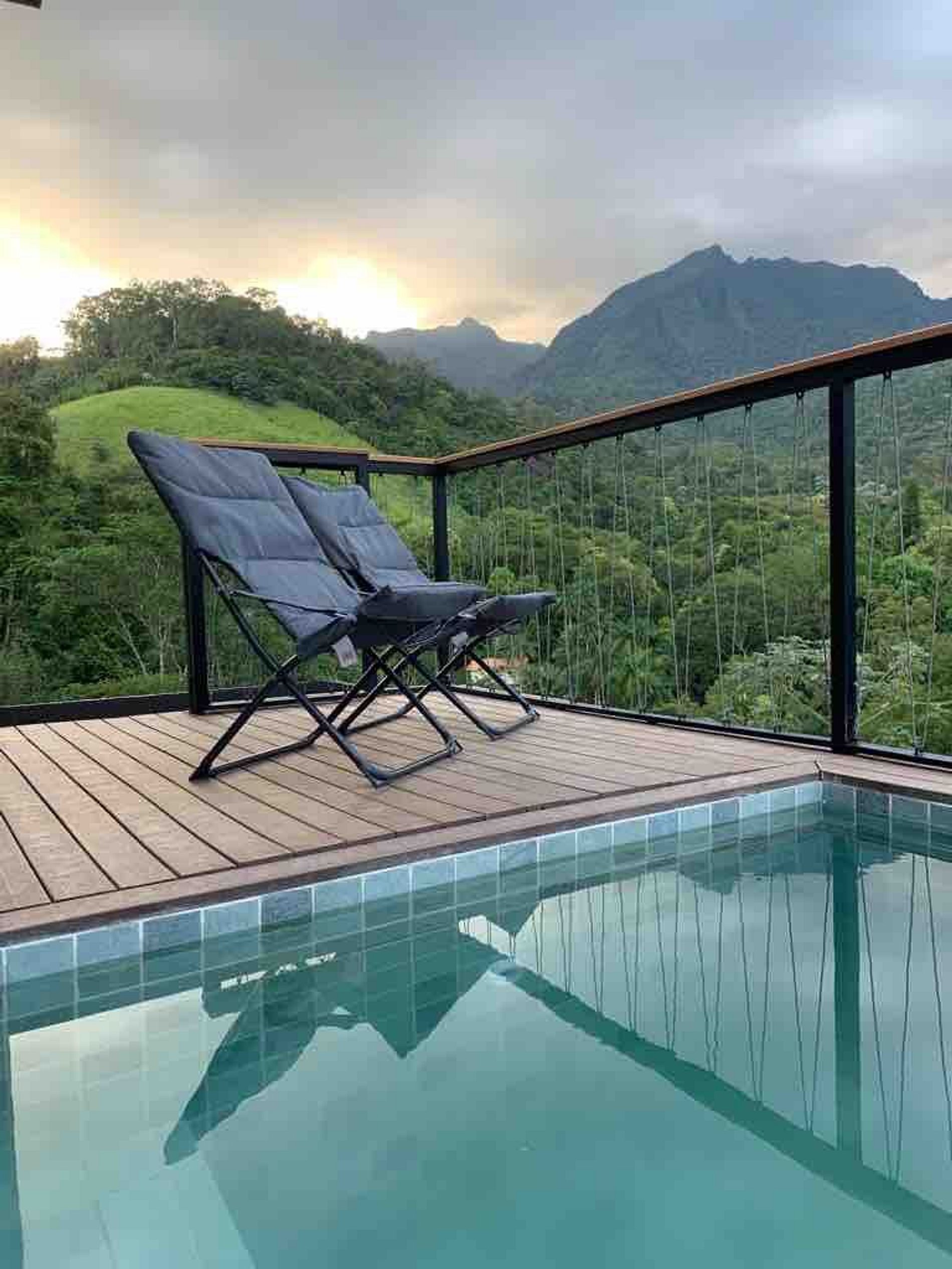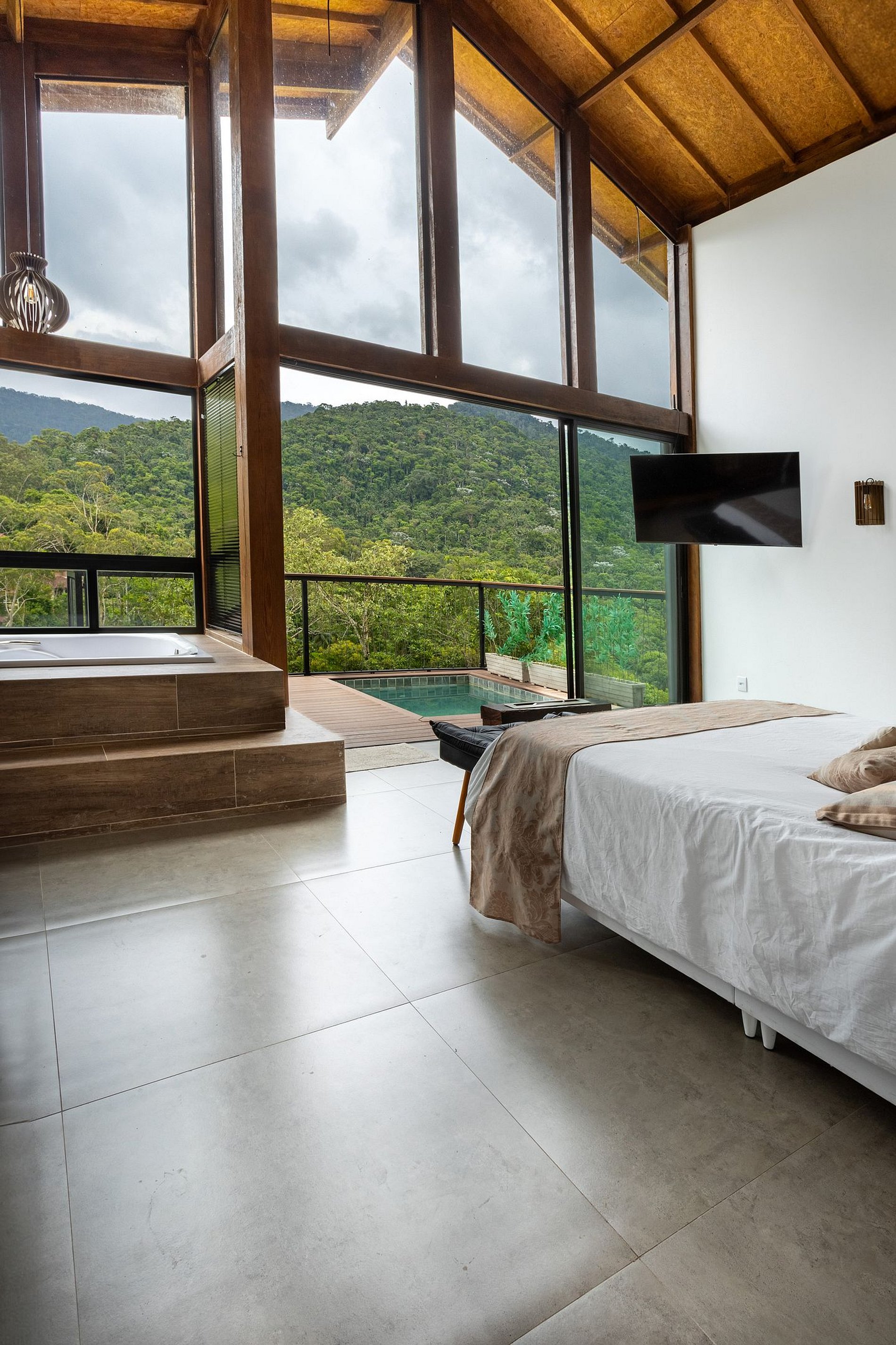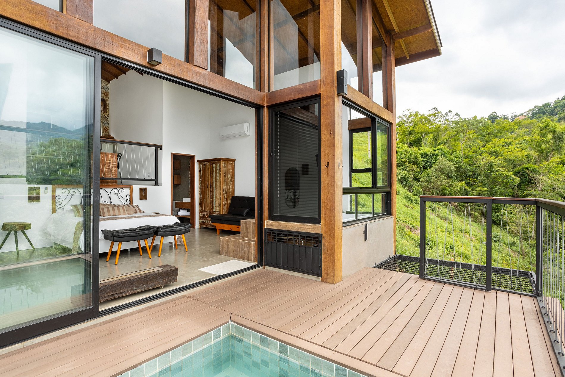 O chalé possui 45 m2 internos e mais 15 mts2 de deck, com piscina, possui um conceito aberto com área interna abrindo para o deck com painéis de vidro que trazem a serra da Índia para dentro do espaço, foi projetado para proporcionar uma experiência única e inesquecível. Possui todas as amenidades necessárias para tornar o espaço aconchegante e relaxante, possui lareira ecológica, cama queen e smart TV 55”, com streaming disponível, internet de fibra ótica, banheiro com chuveiro à gás, secador e toalhas, banheira hidromassagem para dois, cozinha completa, com mesa, cooktop, micro-ondas, geladeira, cafeteira, sanduicheira, aparelho de fondue e demais utensílios. Possui berço disponível (caso solicitado e conforme disponibilidade). Deck externo, com piscina privativa, churrasqueira e uma vista de tirar o fôlego!